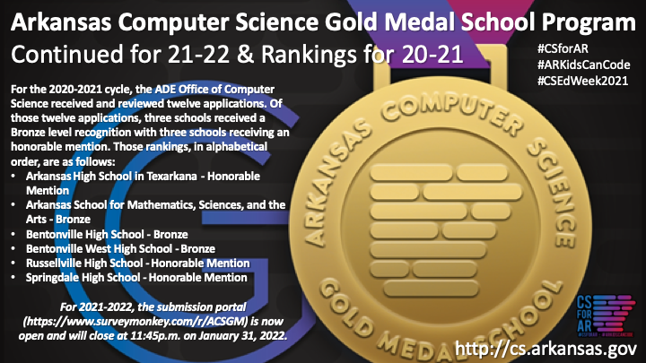 Tuesday, December 7, 2021 - Arkansas Computer Science Gold Medal School Program Continued for 2021-2022 and Rankings for 2020-2021